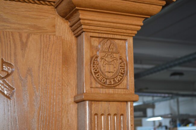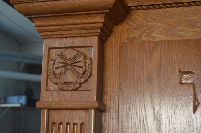 This model includes unit insignia carving, carved doors, as well as deluxe crown molding, base molding, and columns on all four corners.