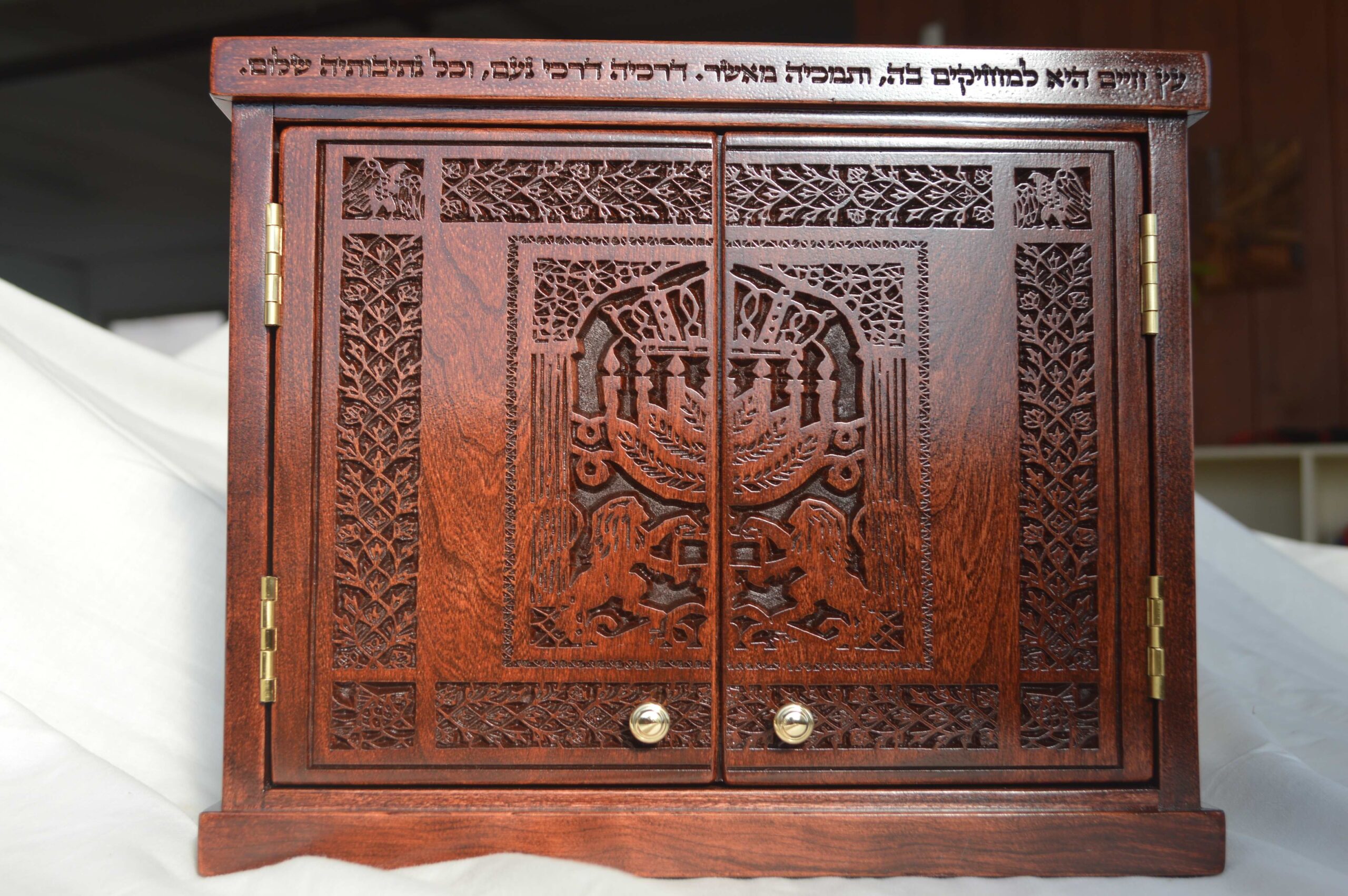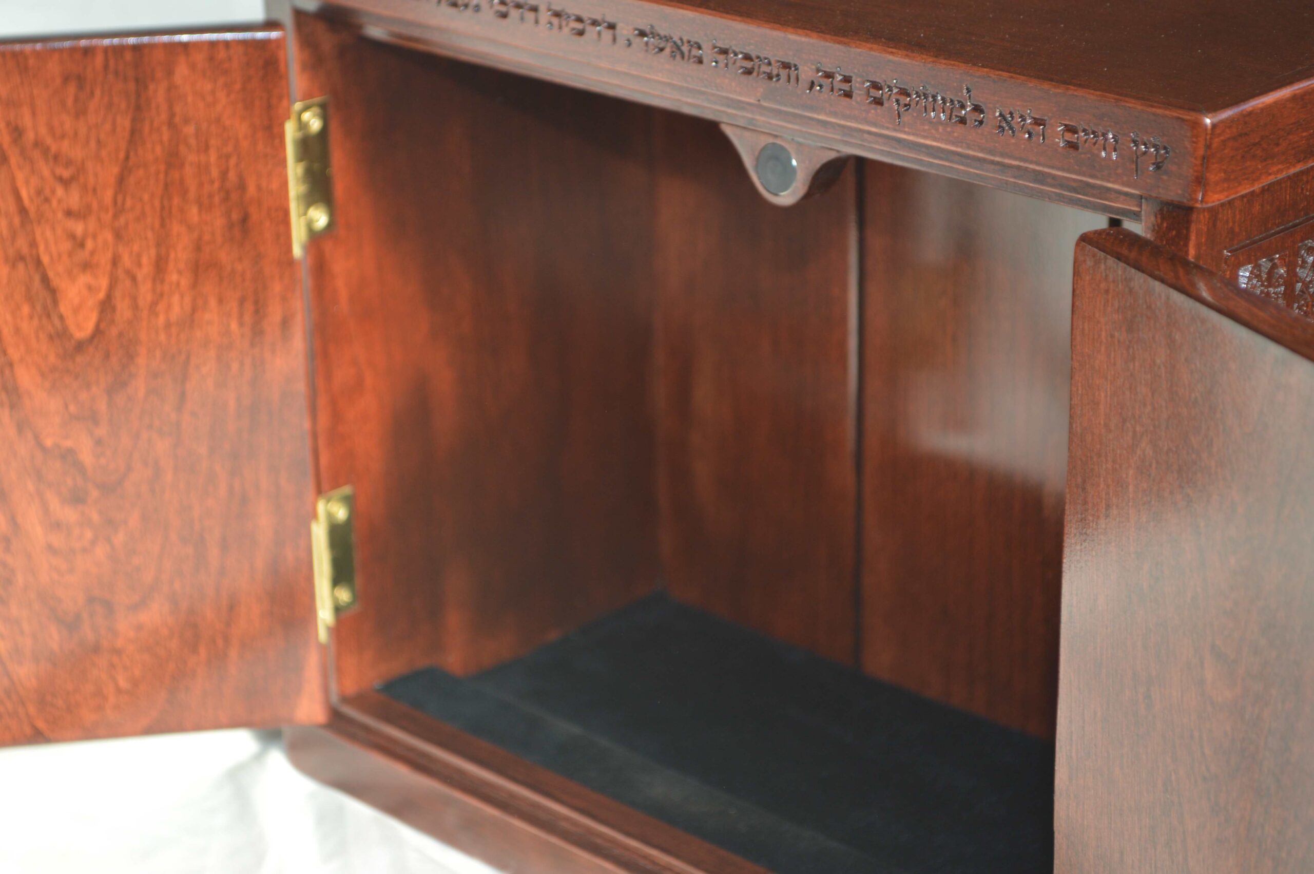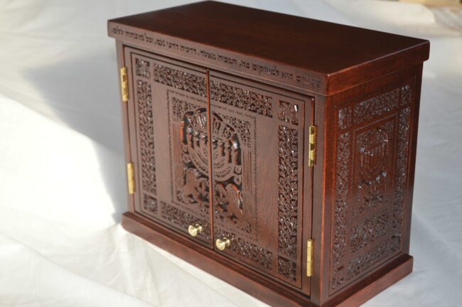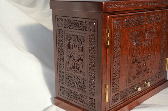Built to accommodate am 8-1/2″ tall sefer torah, this intricately carved aron kodesh comes with its own padded carry case. Can be customized to suit your sefer torah in size and style. Contact us for options.