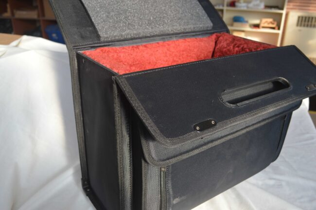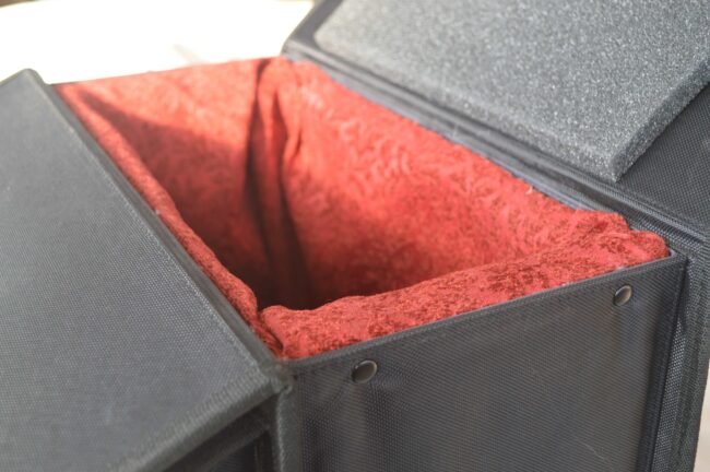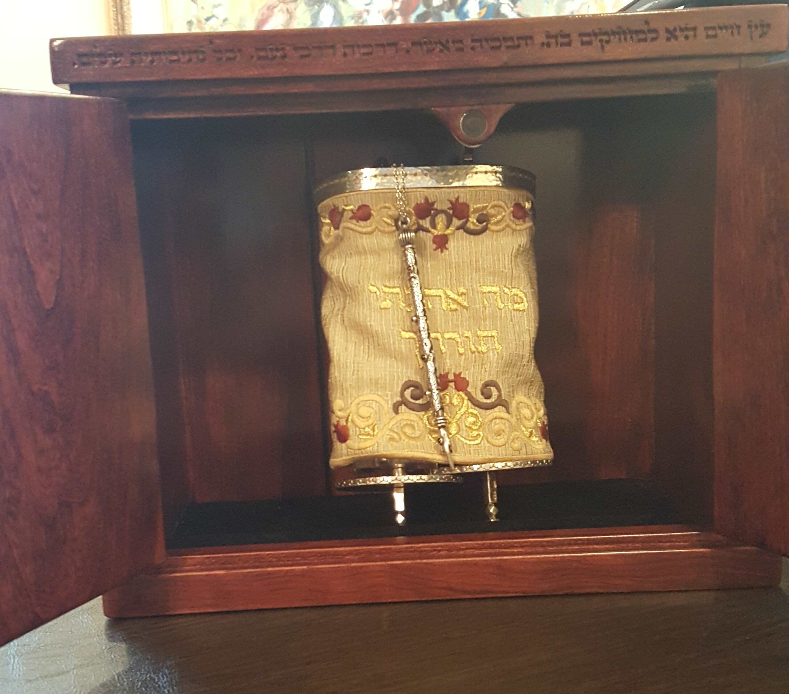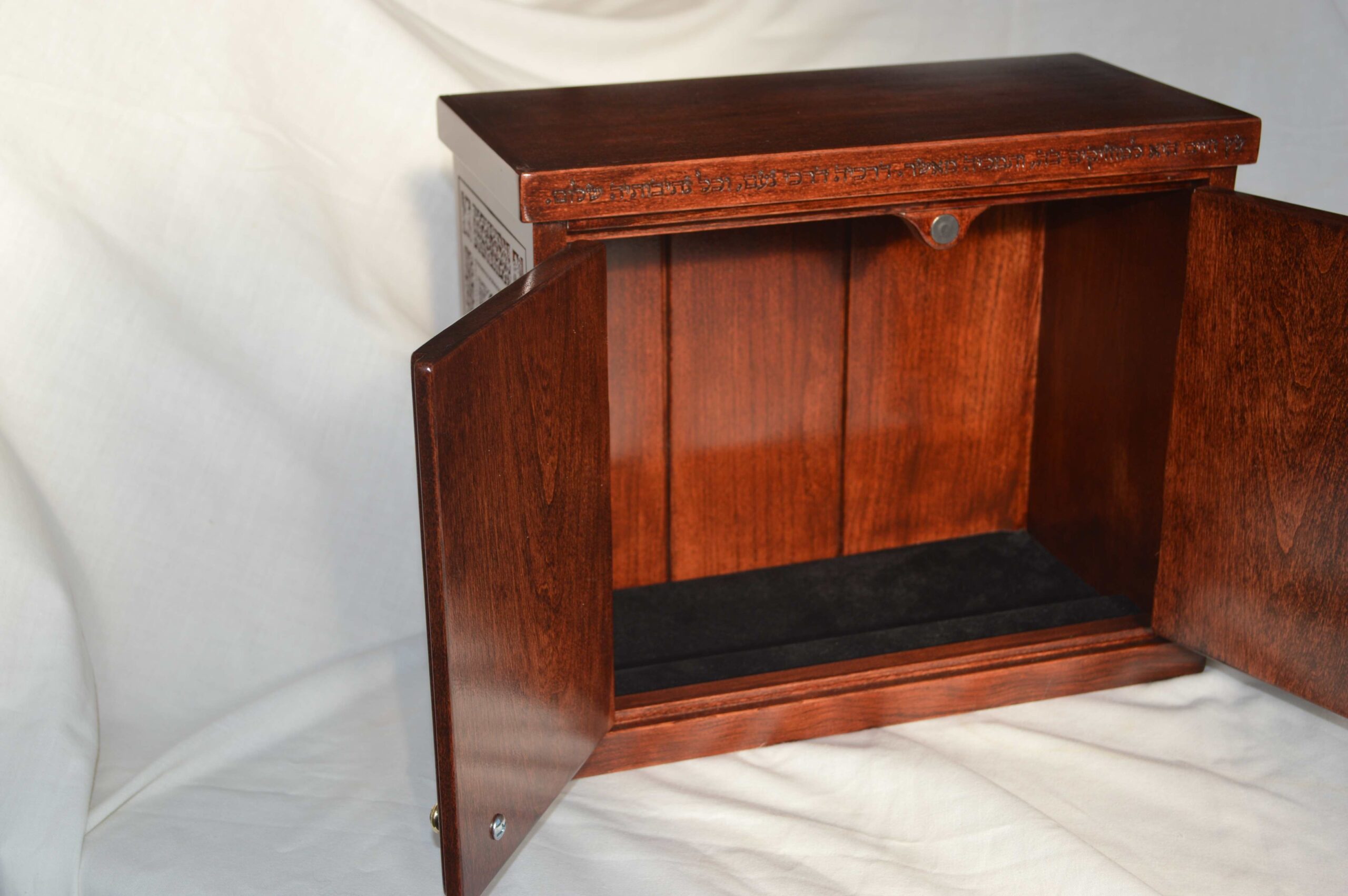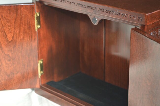 Built to accommodate am 8-1/2″ tall sefer torah, this intricately carved aron kodesh comes with its own padded carry case. Can be customized to suit your sefer torah in size and style. Contact us for options.