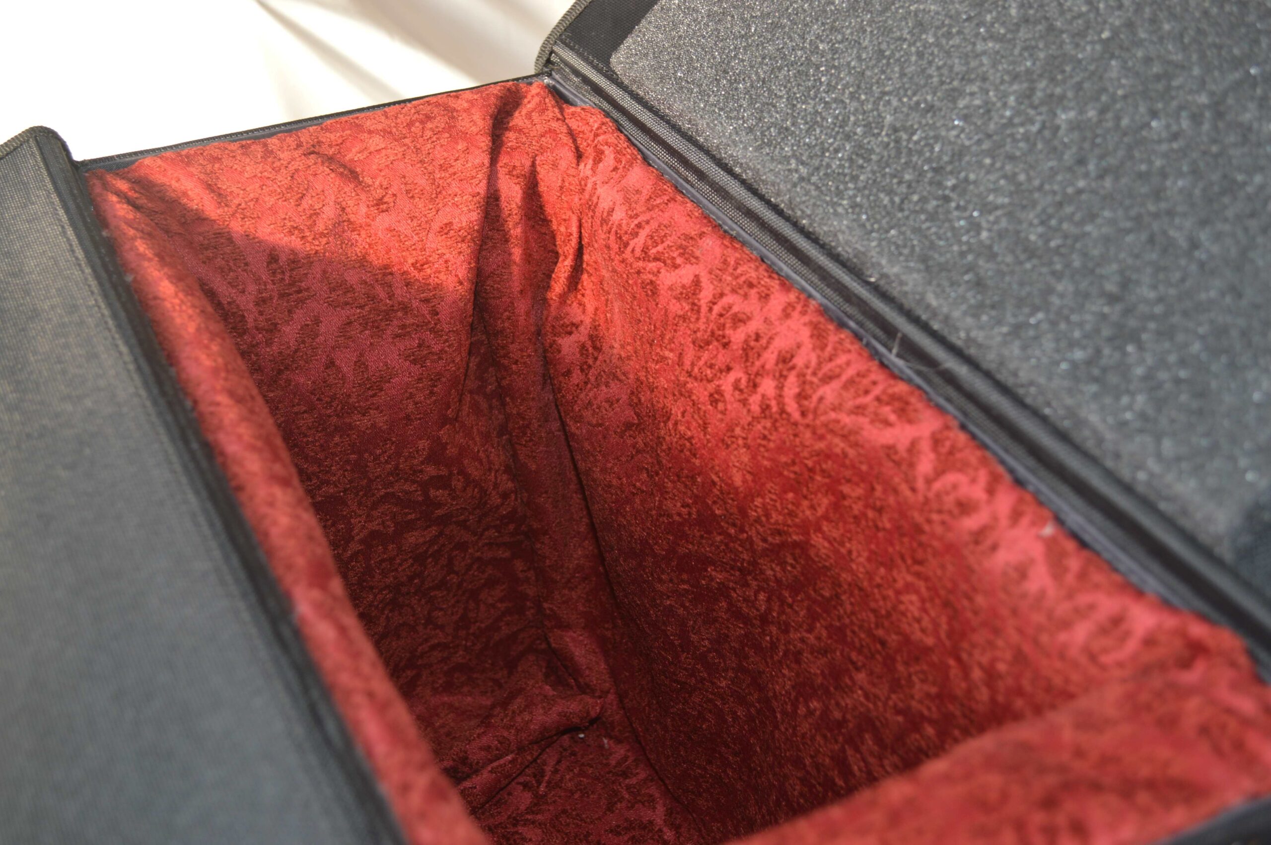 Built of solid cherry with a deep mahogany dye and stain. Solid brass hardware and velvet lining inside.