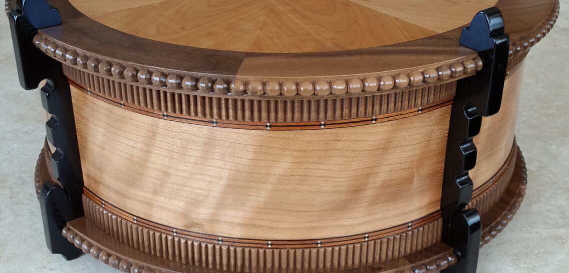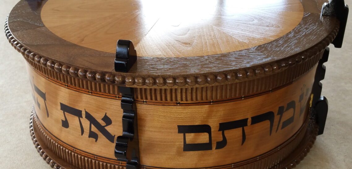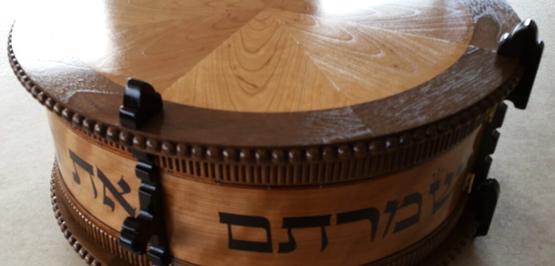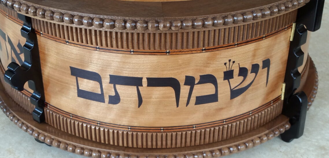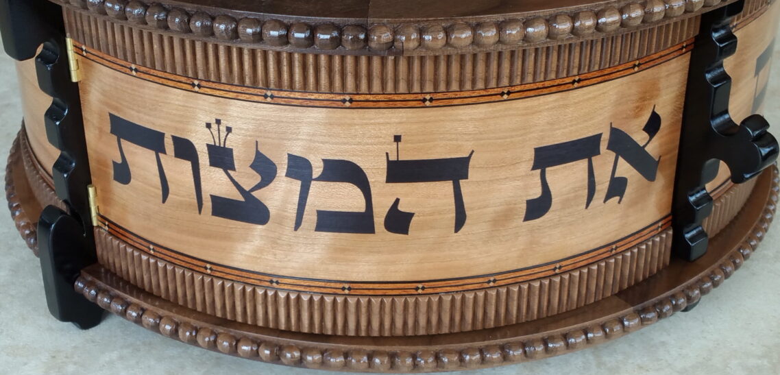 We are pleased to announce this gorgeous Seder Case which will certainly become a family heirloom and the centerpiece of your seder table. A very limited number of these hand built solid wood seder cases will be made, as each takes 2-3 weeks to complete. A single craftsman builds each by hand and completes all the steps along the way, from hand selecting the solid walnut to hand carving the intricately detailed beaded molding. These are built from a combination of woods, including walnut, cherry, mahogany, and maple. The lettering is done with an inlaid-veneer which has been painstakingly cut to precisely fit into the underlying cherry veneer to create crisp and clear letters. The top veneer is inlaid in a sunburst pattern, highlighting the gorgeous cherry grain pattern.
